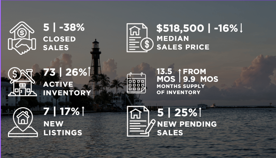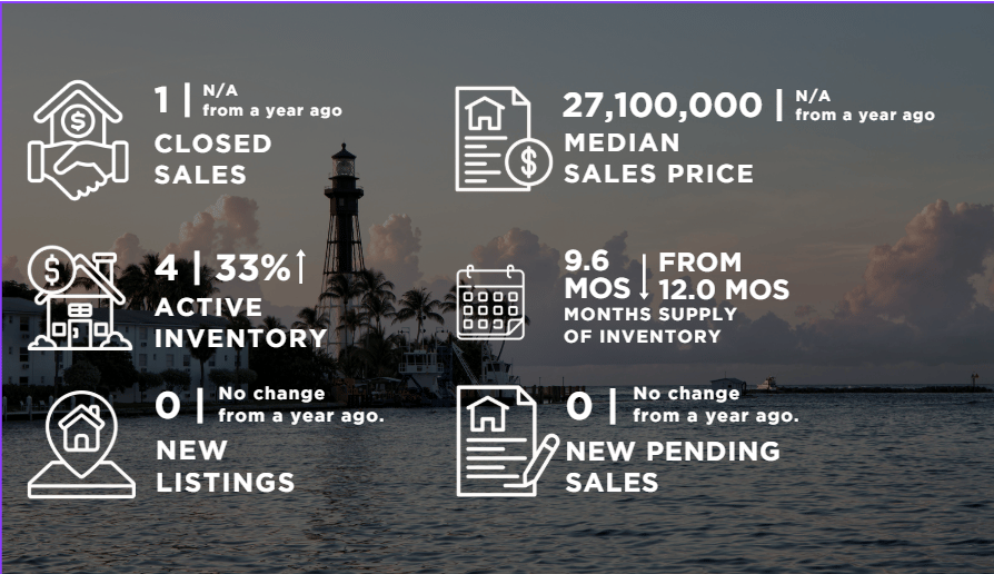The single-family segment in Hillsboro Beach was driven by just one ultra-luxury sale at $27.1 million, underscoring the exclusivity of this market. Despite the limited sales, inventory rose compared to last year, but with no new listings or pending transactions, buyer and seller activity remained minimal.