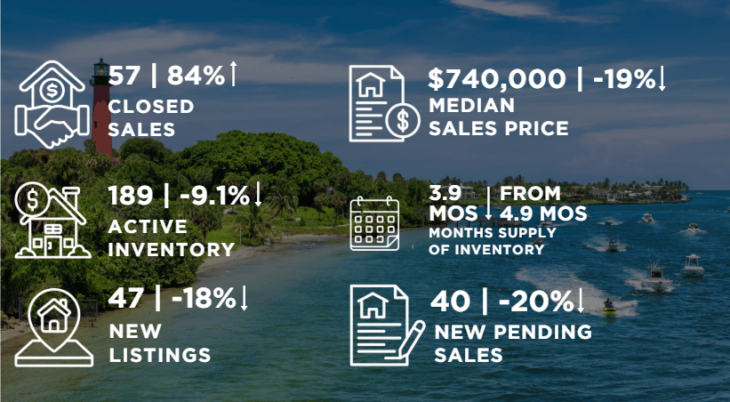 Jupiter’s single-family home segment saw a strong rise in closings even as prices dipped year over year. Fewer new listings and tighter supply are keeping competition healthy, particularly for move-in-ready homes near the coast and golf communities.
