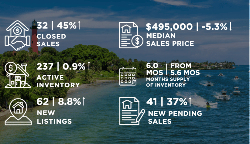 The townhouse and condo market remained steady yet active, with more listings and stronger buyer activity compared to last year. Although prices softened slightly, the rise in pending sales suggests continued appeal for maintenance-free living near Jupiter’s beaches and marinas.