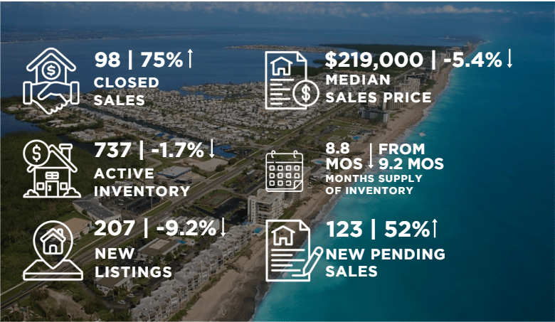 The townhouse and condo segment delivered one of the most striking statistics of the month. Closed sales soared 75% compared to January 2025, landing at 98 transactions, a figure that speaks to renewed confidence among buyers in this category. New pending sales followed suit with a 52% increase to 123, reinforcing that demand is real and growing. Active inventory came in at 737, down slightly by 1.7%, while months supply of inventory dropped to 8.8 months from 9.2 months a year ago, suggesting conditions are gradually tightening. New listings dipped 9.2% to 207, which means fewer options are entering the market even as demand accelerates. The median sale price settled at $219,000, a modest 5.4% decrease year over year, keeping this segment accessible for buyers looking for value in Martin County.